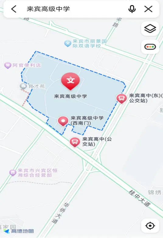 ▲來(lái)賓高級(jí)中學(xué)交通指引圖(來(lái)賓市興賓區(qū)桂中大道588號(hào))。
