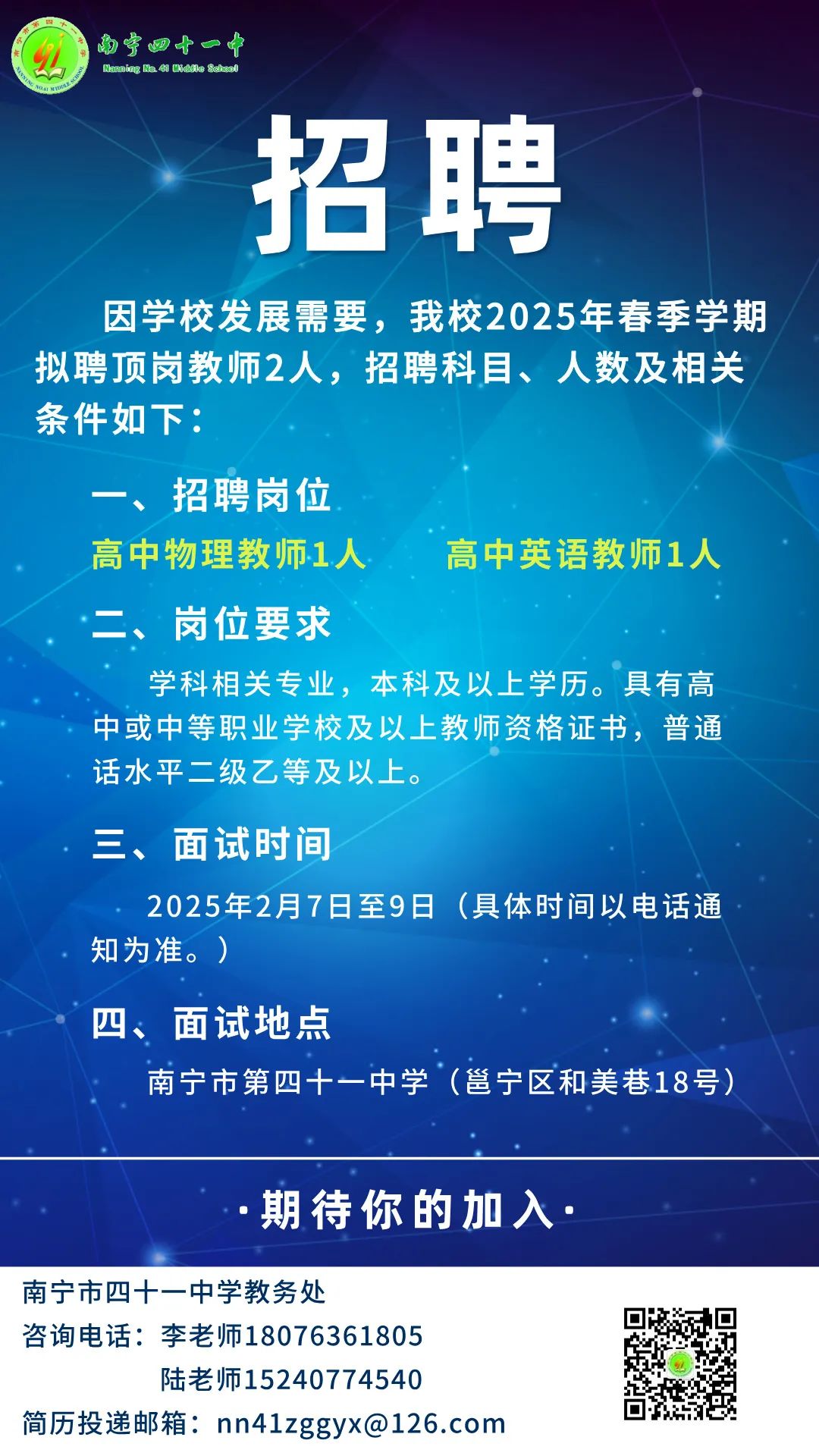 2025年春季學期南寧市第四十一中學關(guān)于公開招聘頂崗教師2人