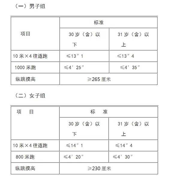 4.報(bào)考人員須參加全部三項(xiàng)體能測評,全部達(dá)標(biāo)方為合格,如放棄一項(xiàng)則視為不合格,體能測評合格的方可進(jìn)入下一環(huán)節(jié)。