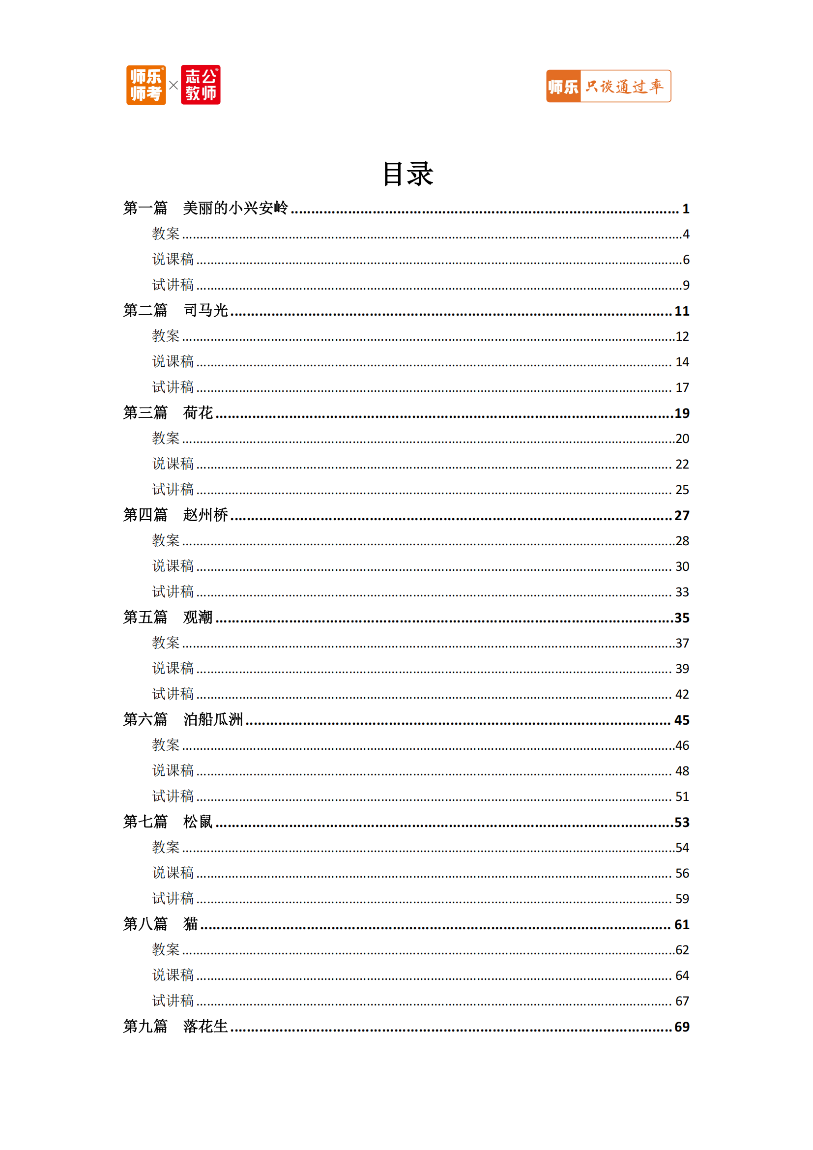 教材分析分學科+分版本+分學段+分課型+分課題;對篩選出的重點課型所涉及的教材內(nèi)容進行詳細解讀,分析其教學目標、教學重難點、教學過程及板書設計;幫助考生快速梳理教材內(nèi)容,在練習一個篇目的同時學會一類篇目的設計思路。
