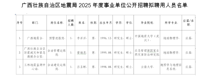 廣西壯族自治區(qū)地震局2025年度事業(yè)單位公開招聘擬聘用人員公示