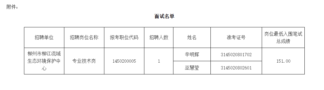 (三)成績公布:面試成績將于面試結(jié)束后當(dāng)天在柳州市生態(tài)環(huán)境局一樓公示欄進(jìn)行公示,并同步發(fā)布于柳州市生態(tài)環(huán)境局網(wǎng)站(http://sthjj.liuzhou.gov.cn),請考生自行查看。