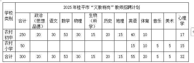 經(jīng)自治區(qū)教育廳、黨委編辦、財政廳、人社廳批準,2025年桂平市“義教特崗”教師招聘計劃共300名,其中初中250名、小學50名。詳情見下表: