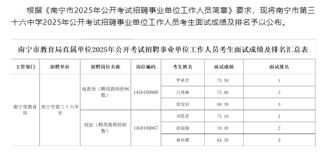 南寧市教育局關(guān)于公布南寧市第三十六中學(xué)2025年公開(kāi)考試招聘事業(yè)單位工作人員考生面試成績(jī)及排名的公告