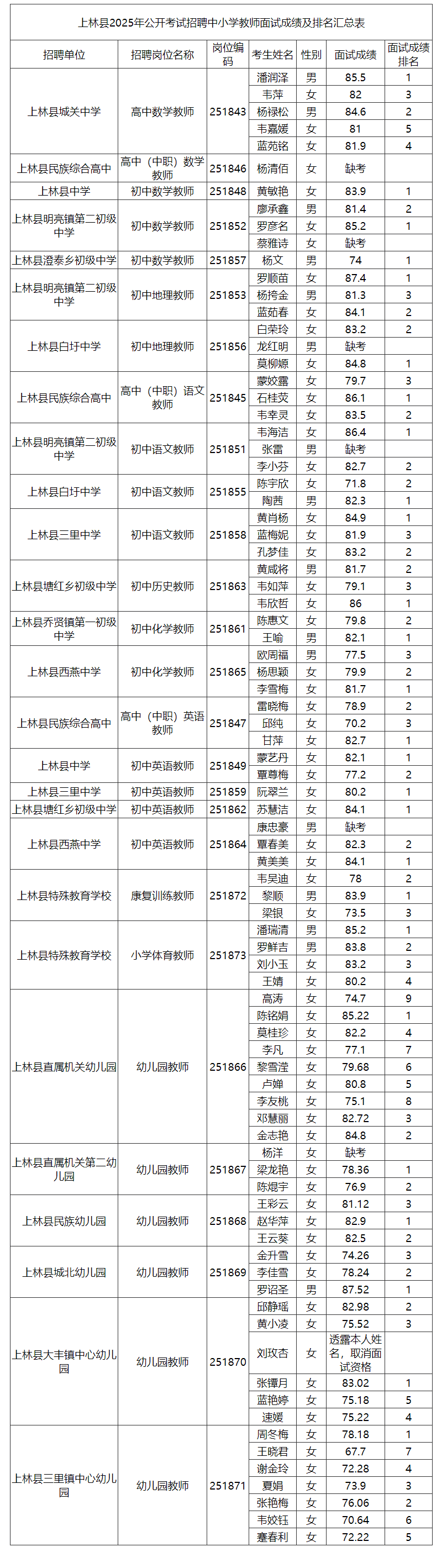 上林縣2025年公開(kāi)考試招聘中小學(xué)教師面試成績(jī)及排名公告