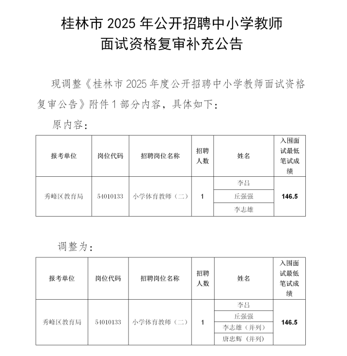 桂林市2025年公開(kāi)招聘中小學(xué)教師面試資格復(fù)審補(bǔ)充公告