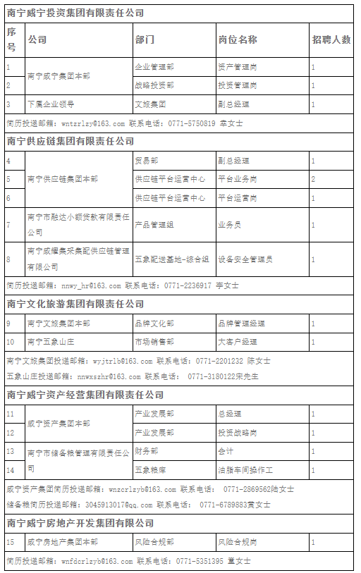 南寧威寧投資集團(tuán)有限責(zé)任公司現(xiàn)因集團(tuán)業(yè)務(wù)高速發(fā)展需要,集團(tuán)本部及各下屬企業(yè)誠邀各類優(yōu)秀人才加盟,公司將提供完善的激勵晉升機(jī)制及廣闊的發(fā)展空間。熱忱歡迎有志之士加盟,公司將為您提供完善的激勵晉升機(jī)制及廣闊的發(fā)展平臺,招聘崗位、人數(shù)及崗位要求詳見附件。