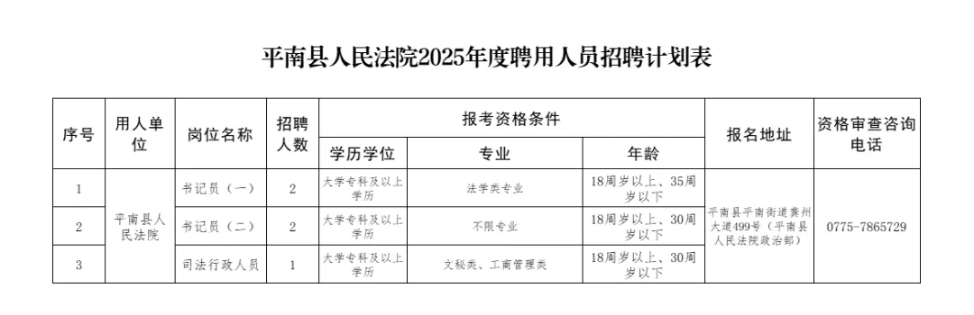 本次招聘崗位為書(shū)記員4名,司法行政人員1名。詳見(jiàn)附件1《平南縣人民法院2025年度聘用人員招聘計(jì)劃表》(以下簡(jiǎn)稱(chēng)《招聘計(jì)劃表》)。