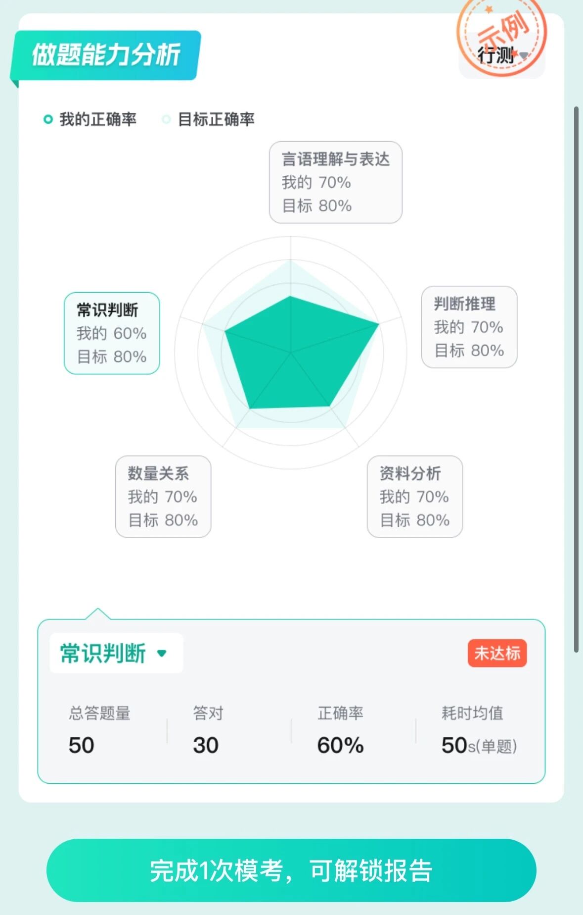 3??生成個人??紙蟾妫?/span>考完就能查看模考成績、排名及解析,生成的個人模考報告包含各模塊正確率分布、做題能力分析、筆試分數(shù)yu測等內(nèi)容。
