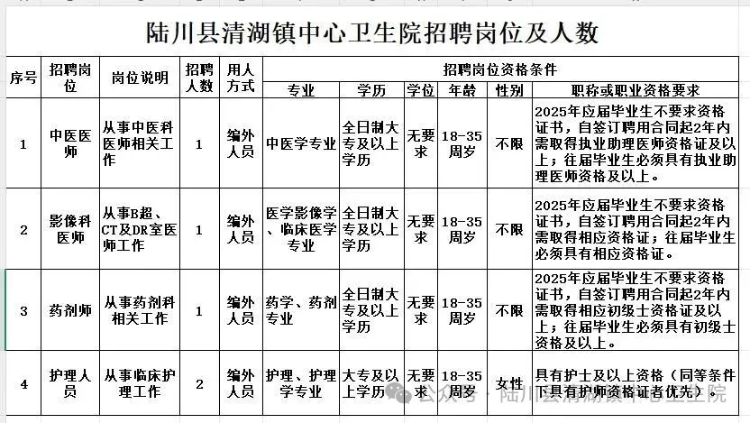 報名地點:陸川縣清湖鎮(zhèn)中心衛(wèi)生院五樓辦公室。