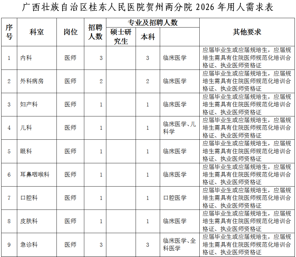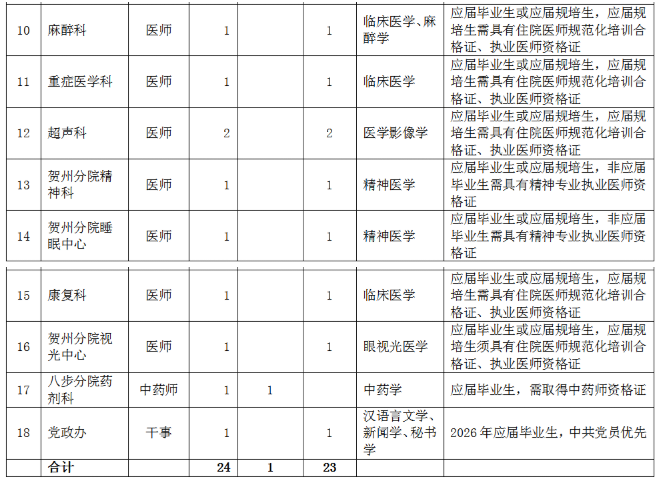 (應(yīng)聘報名二維碼)同時,按以下要求提供個人應(yīng)聘材料(電子版)發(fā)電子郵箱:gdyy2817726@163.com(郵件主題請標明:“姓名+賀州兩分院”字樣)。應(yīng)屆畢業(yè)生:個人簡歷、身份證、就業(yè)推薦表、成績單、各種獎項獎勵證書、外語等級證書等。非應(yīng)屆畢業(yè)生:個人簡歷、身份證、畢業(yè)證、畢業(yè)證備案登記表、學位證、學位證備案登記表、職稱證、執(zhí)業(yè)證、住院醫(yī)師規(guī)范化培訓(xùn)合格證、工作證明等。報名時所提交的申請材料必須真實、準確,因報名時提交的申請材料不真實、不完整或錯誤填寫報名信息,造成資格審查、面試資格審查不通過的,后果由報名人員自行承擔。(2)資格審核。人事科依據(jù)招聘公告和用人需求規(guī)定的資格條件對應(yīng)聘人員簡歷進行收集和資格初步審查,經(jīng)招聘工作領(lǐng)導(dǎo)小組審核后,確定符合崗位條件報名人員名單,由醫(yī)院人事科電話或短信通知符合條件人員。(3)考核??己斯P試和面試由人事科負責組織實施,協(xié)助部門為醫(yī)務(wù)部、護理部、科教科以及用人科室,紀律監(jiān)督部門為監(jiān)察室。逾期未參加則視為自愿放棄。(4)試工。通過考核的非應(yīng)屆畢業(yè)應(yīng)聘人員,須到醫(yī)院試工5天。試工不通過,不予聘用。(5)體檢。體檢工作由廣西壯族自治區(qū)桂東人民醫(yī)院按照有關(guān)規(guī)定統(tǒng)一組織。體檢標準參照《廣西壯族自治區(qū)事業(yè)單位公開招聘人員體檢通用標準(試行)》《廣西壯族自治區(qū)事業(yè)單位公開招聘人員體檢操作手冊(試行)》執(zhí)行。體檢不合格或隱瞞真實情況致使體檢結(jié)果失真的,不予聘用。因體檢不合格空缺崗位的,將按考核的綜合成績,從高到低,順位補充體檢人員。(6)公示和聘用。對擬聘非應(yīng)屆畢業(yè)應(yīng)聘者在全院范圍內(nèi)進行公示,公示期為5個工作日,公示期滿無異議按程序辦理聘用手續(xù)。對公示有異議,經(jīng)核實影響聘用的,取消其聘用資格;對反映問題難以核實的暫緩聘用,待核實清楚后按有關(guān)規(guī)定辦理。