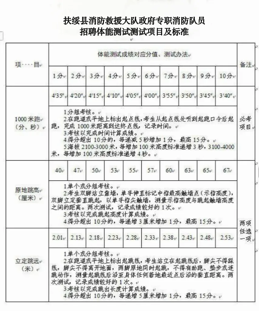 注意事項(xiàng):體能測(cè)試有兩項(xiàng)及兩項(xiàng)以上不得分的視為不合格(標(biāo)準(zhǔn)參照附件)。未按時(shí)參加或因身體原因無法測(cè)試者,視為自動(dòng)放棄。