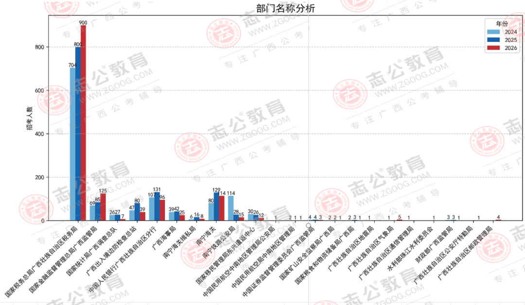 在今年,廣西國稅系統(tǒng)這個(gè)招考“大戶”,招錄漲到了900人,職位數(shù)占比66%。此外,國家金融監(jiān)督管理總局廣西監(jiān)管局招125人,呈正增長,與2025年國考相比漲幅47%。南寧海關(guān)從2025年招錄129人,2026年只招錄114人,相比縮減了11.63人。