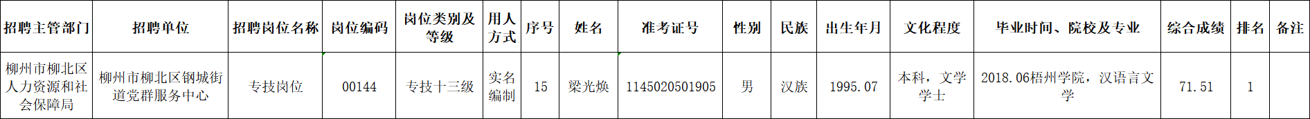 根據(jù)《柳州市2025年度下半年事業(yè)單位公開(kāi)考試招聘工作人員公告》要求及安排,梁光煥同志經(jīng)面試、考察、體檢合格,符合聘用條件。經(jīng)研究決定,擬聘用梁光煥同志為我區(qū)事業(yè)單位工作人員,現(xiàn)予以公示,公示期為5個(gè)工作日(2026年1月22日至2026年1月28日)。對(duì)擬聘用的同志如有異議,請(qǐng)以書(shū)面形式,并署真實(shí)姓名和聯(lián)系地址,于2026年1月28日前郵寄或直接送我單位(地址:柳州市勝利路12-8號(hào)柳北區(qū)政府4樓417室;郵編:545002,電話0772-2513360),群眾如實(shí)反映有關(guān)問(wèn)題受法律保護(hù)。