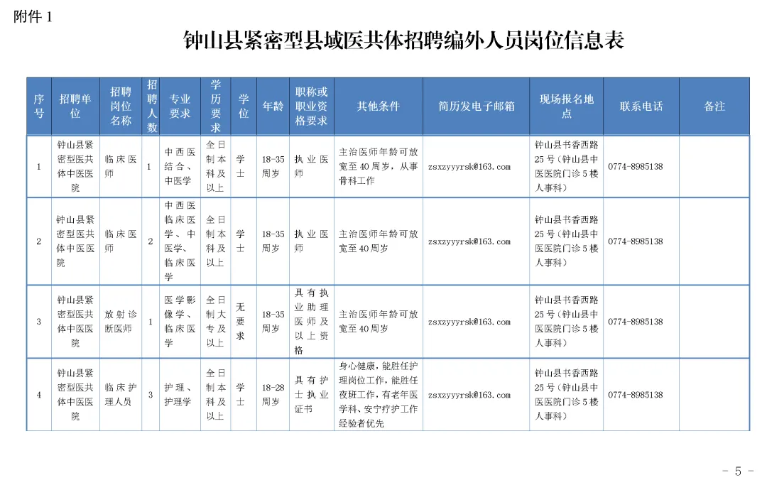 5.崗位具體信息及要求詳見附件1《鐘山縣緊密型縣域醫(yī)共體招聘編外人員崗位信息表》(如下圖)。